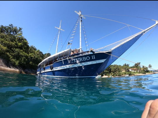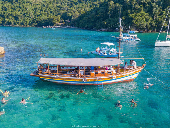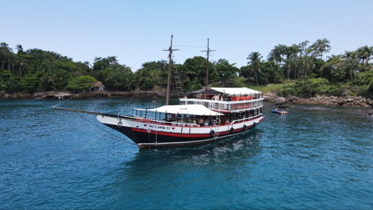Navegue pelas aguas cristalinas de Paraty á bordo da Lancha Vida Nova.